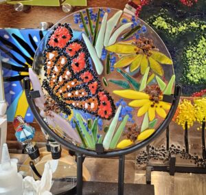 Glass fusing is the art of taking colored glass and layering it in such a way that it fuses together in a glass kiln. I’m often asked, can I bring in some glass that I have, such as sea glass collected on the beach, or stained glass pieces. Unfortunately, the answer is always no, it won’t be compatible. Every piece of glass has a temperature where it softens, thereby allowing the glass to fuse to a base piece. If those fusing temperatures are not the same in the two pieces of glass, the glass cracks when it cools.