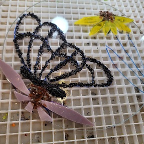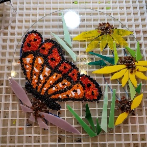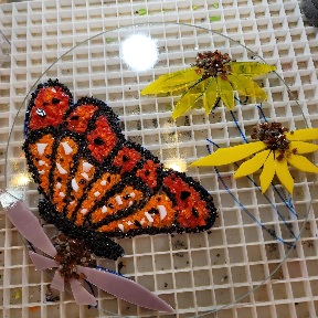 Our classes begin promptly at 10 am each day (and I occasionally offer 1 pm classes when the morning is full). Feel free to arrive a few minutes early, and you’ll have a chance to wander through the garden to see dozens of examples. Copying one of my ideas is wholeheartedly encouraged! The first thing I’ll ask of you is to decide the shape and size of the piece you’d like to make. We have square, round and totems for the garden. If you are wanting to make something for your garden, the price will be around $100 and up with the display stand. If you are wanting a less expensive project, a small hanging piece will be in the $30 and up range. Do realize that sometimes smaller can be a little harder to do, as it can be difficult to manipulate the glass into a small space. I’ll teach you how to cut and assemble the glass, and then I’ll fire your glass. It’s a long tedious process in my kiln, so you’re glass will be ready to pick up 2 days later. I do offer shipping on most glass projects if you can’t return, and an additional shipping fee applies.